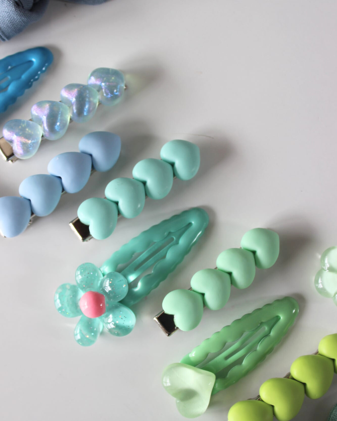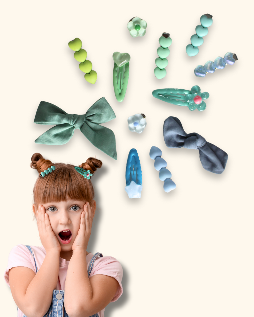 Each Colour Crush Bundle includes 12 playful accessories – a mix of 2 cotton Bows, Statement Clips, and Clip Pops – all hand-picked in dreamy colour themes (choose between Blue/Green or Yellow/Peach).